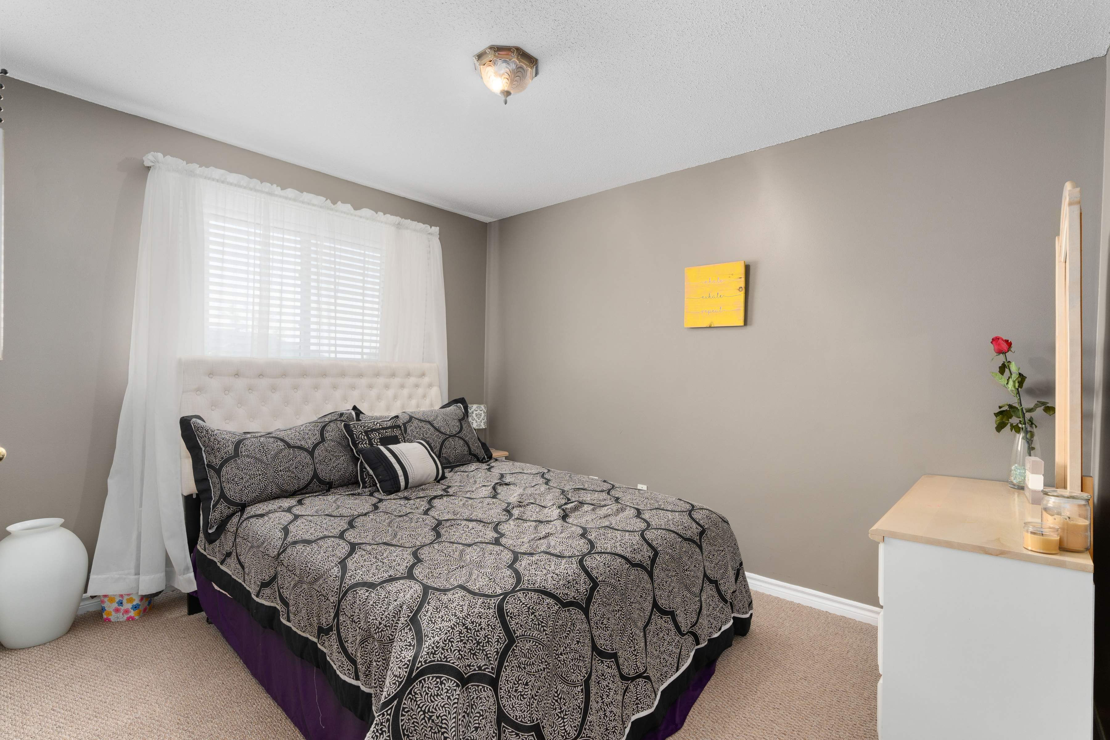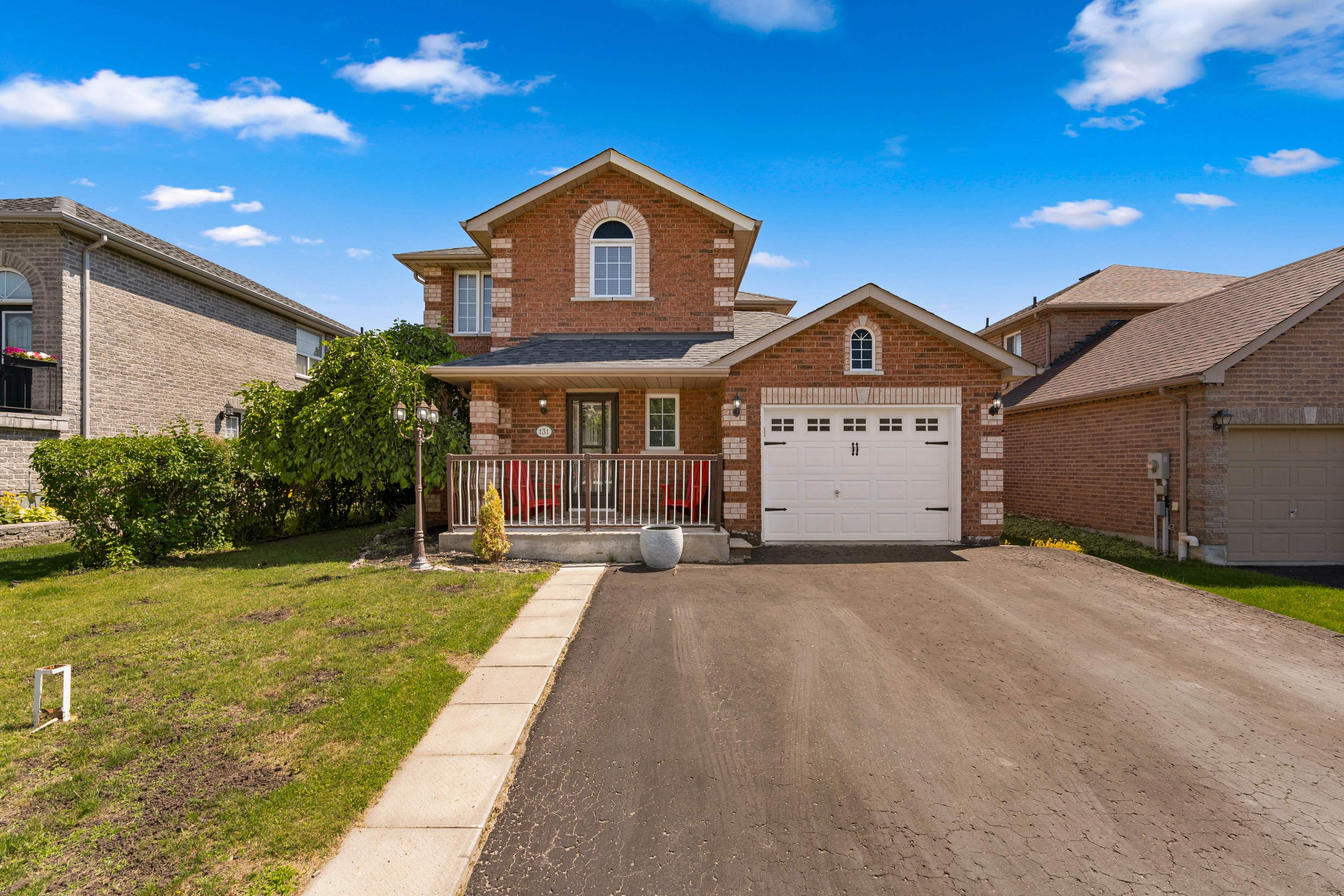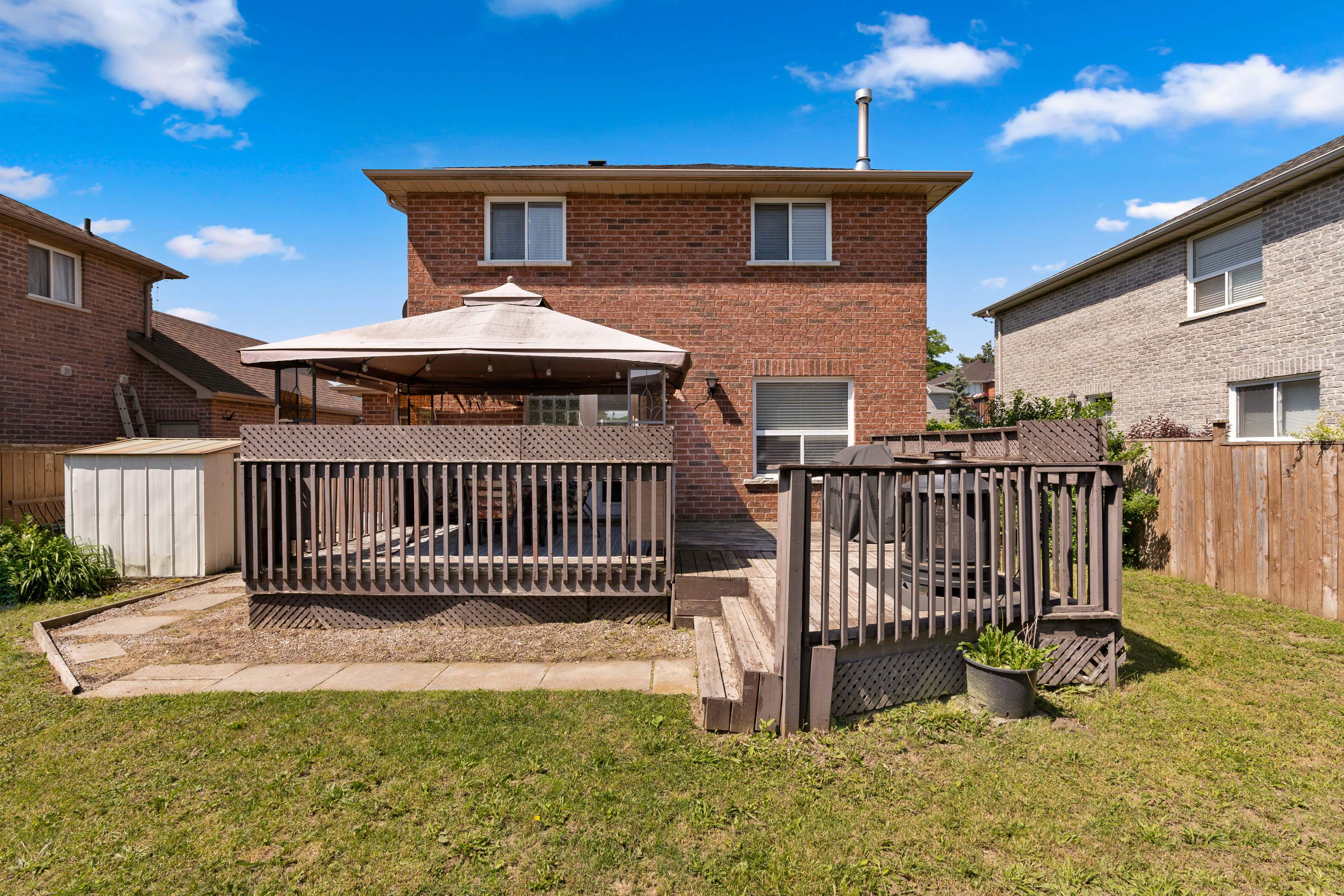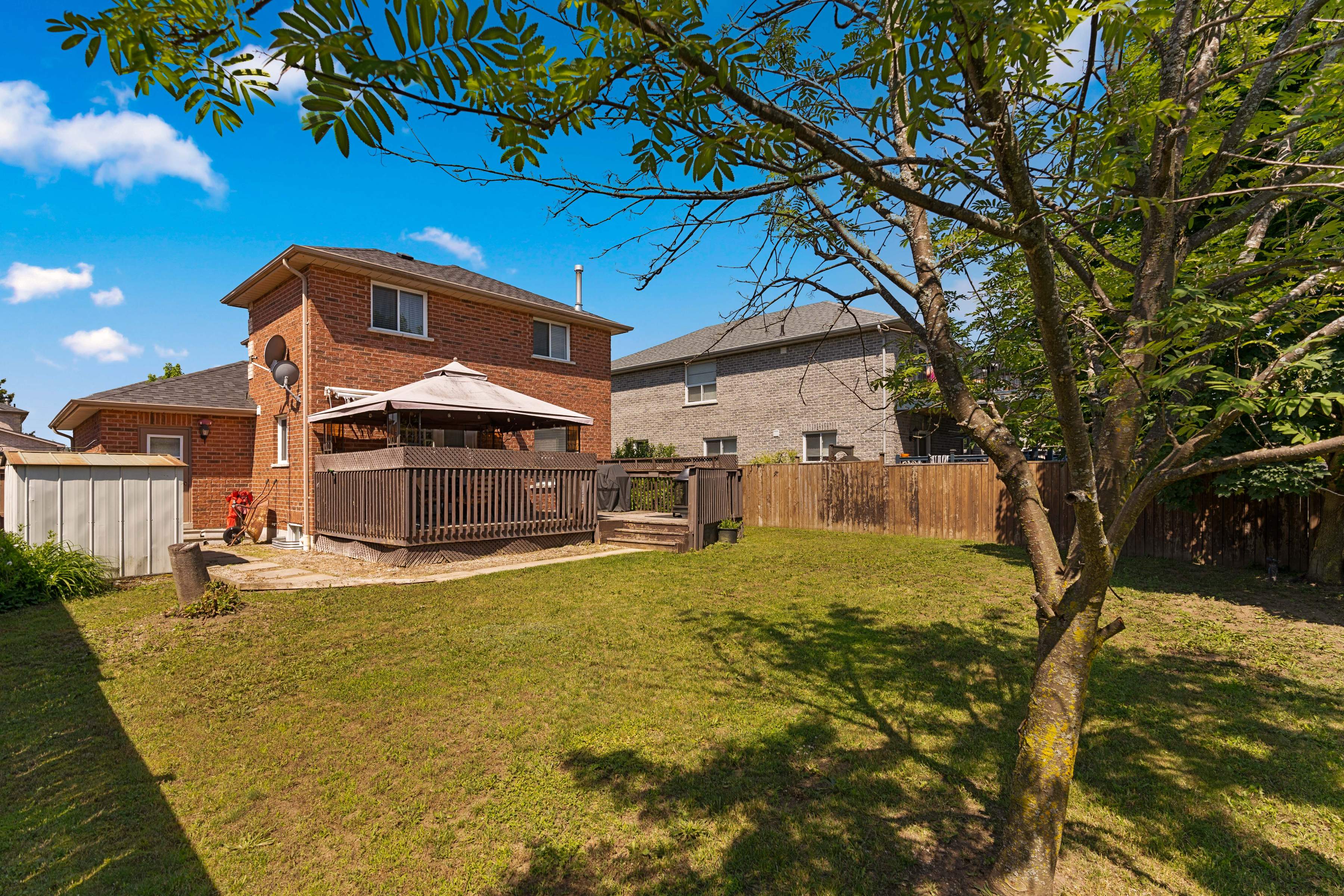 Lovely sought after family area, this fully detached all brick freehold home is perfect if you’re looking to not be in a link or townhome and wanting the neighbourhood with all of the large family homes. With double wide driveway, huge fully fenced yard with large deck and inside garage entrance you will be pleased with every turn. Step inside the bright open living space with lovely stone accent wall (tv included) neutral decor, laminate flooring (2018) open to the dining and kitchen space (with handy pantry) and ceramic flooring. There is also a 2-piece bathroom on this level with crown moulding and access to the back yard via the kitchen where you will also find a handy shed tucked around the side and room for a pool, trampoline or playset. Back inside, upstairs there are two bedrooms. The primary bedroom is accessed via the double French doors and is over 22 feet long with dual closets and some families have turned this into two bedrooms (making three possible on the second level). A beautifully updated 5-piece bathroom has double vanity and deep soaker tub. Downstairs a huge space either as another bedroom or rec space (with inside garage entrance perfect for teenagers), a gym space and updated laundry area as well as a cold cellar. There is also AC, and central vacuum and you’re only 6 minutes to the HWY. Welcome home!