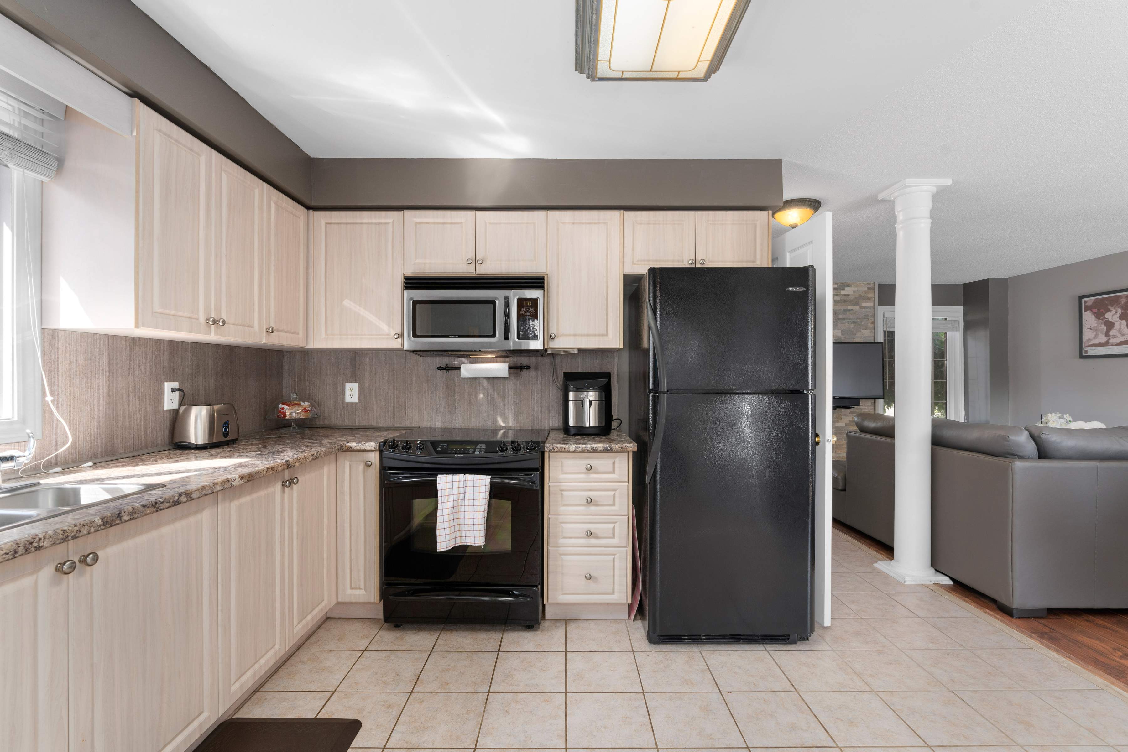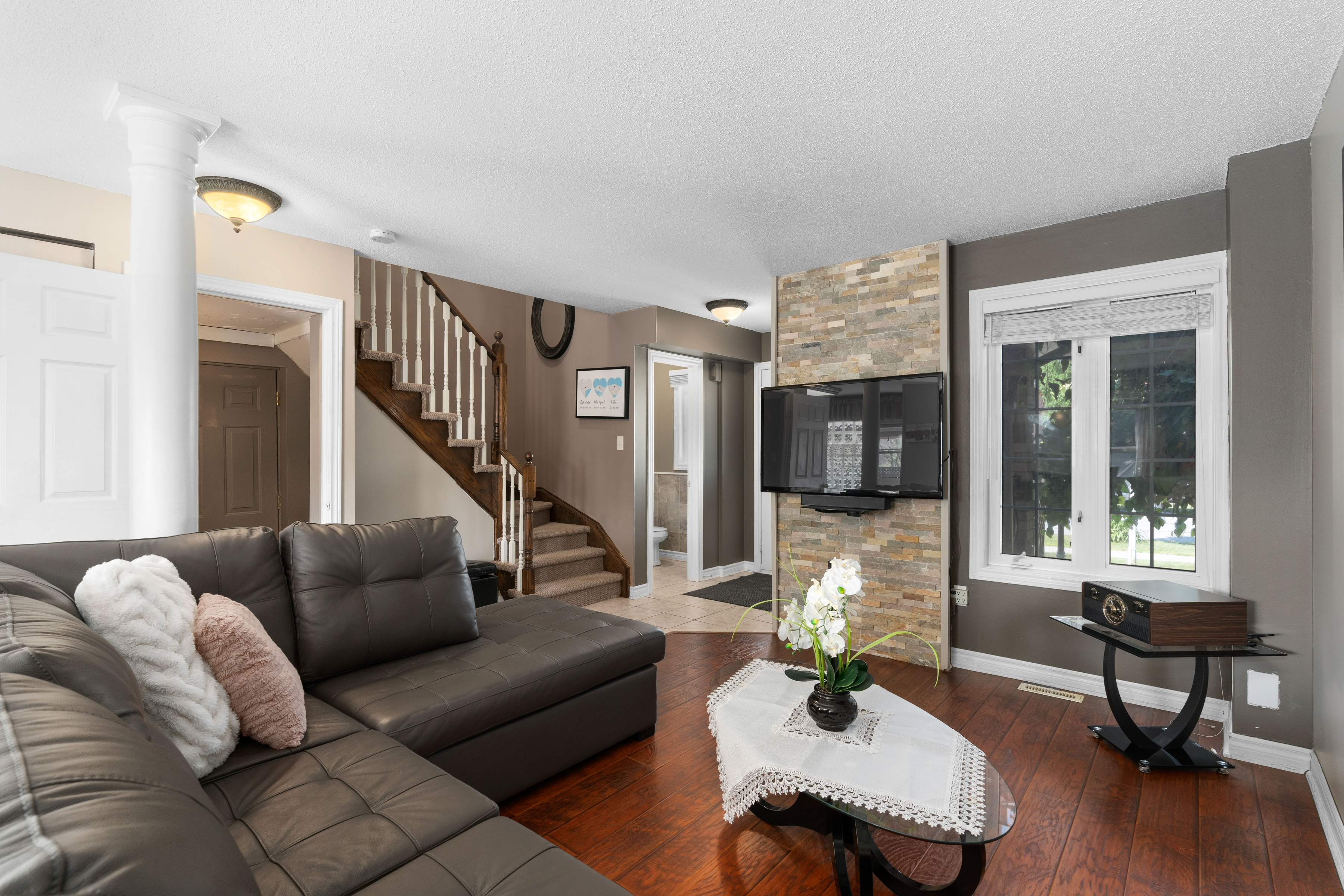 • Bright open living space: with lovely stone accent wall (tv included) neutral decor, laminate flooring (2018) open to the dining and kitchen space (with handy pantry) and ceramic flooring