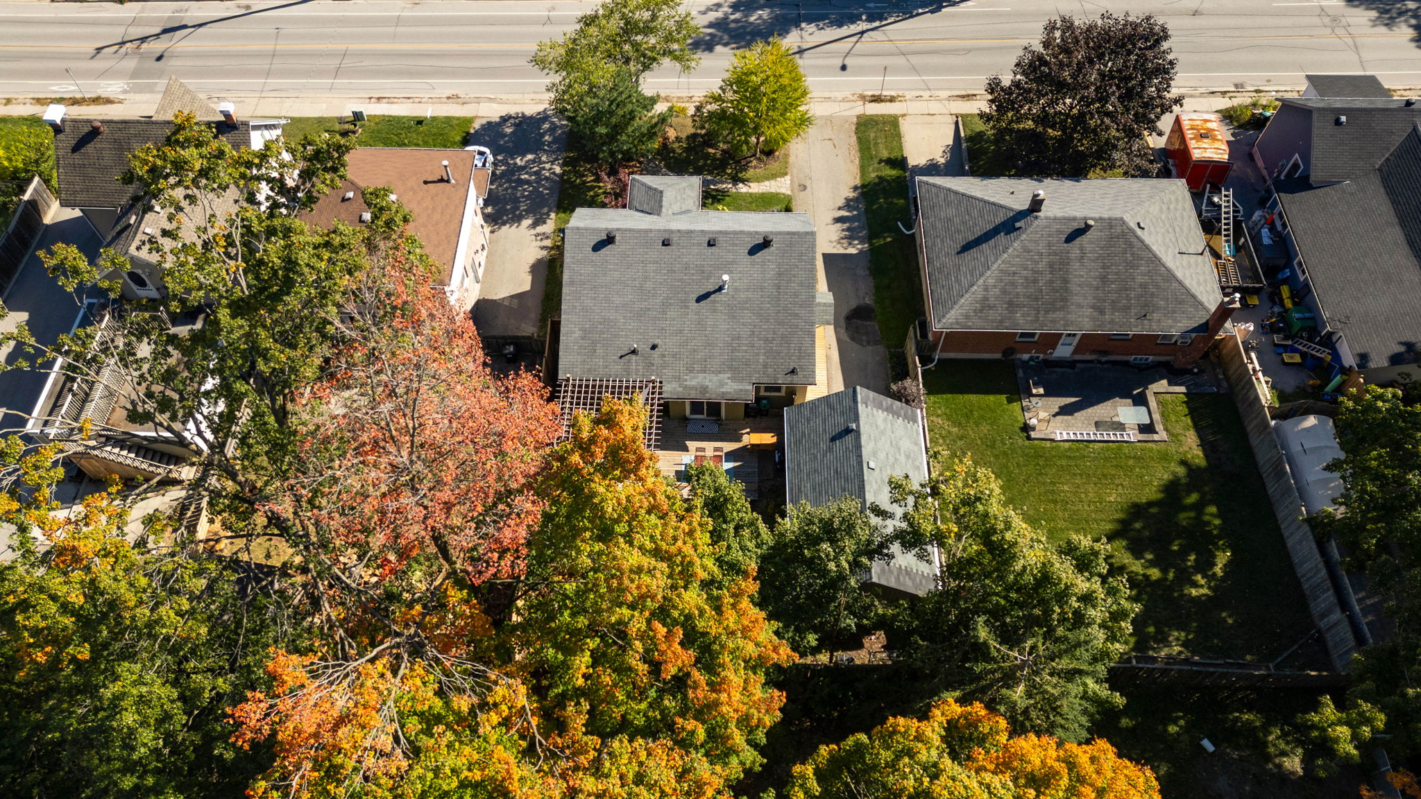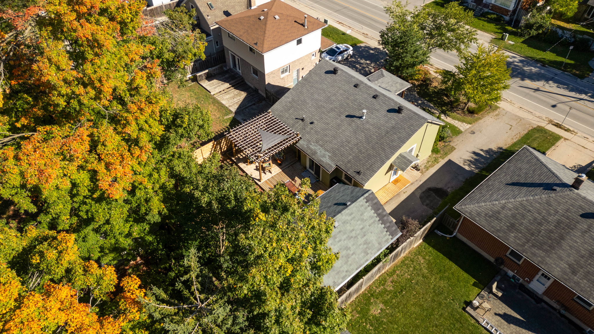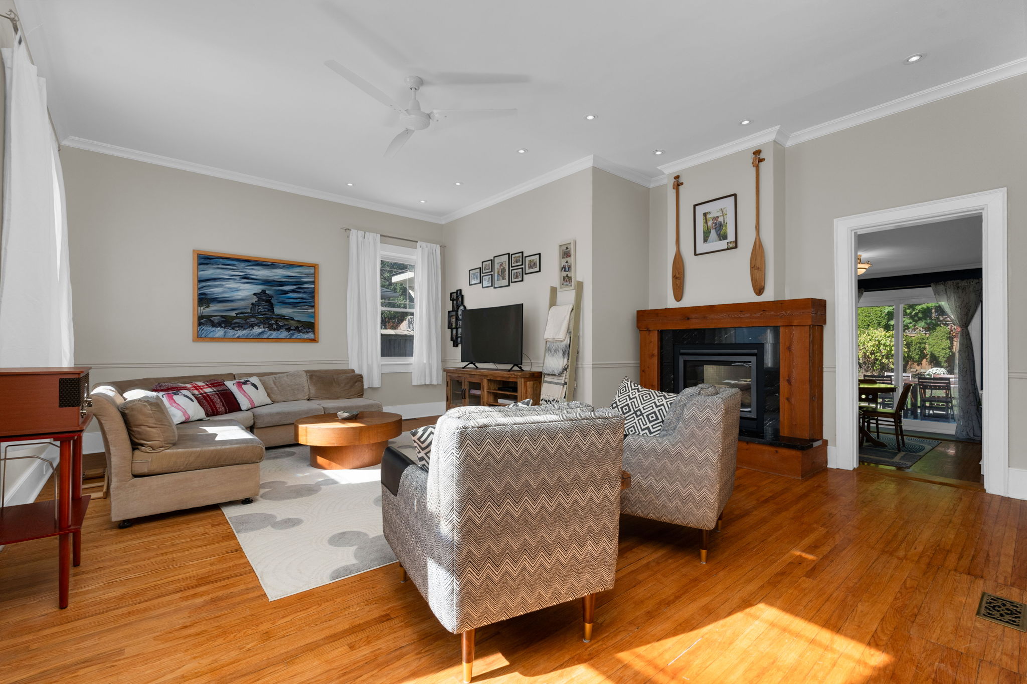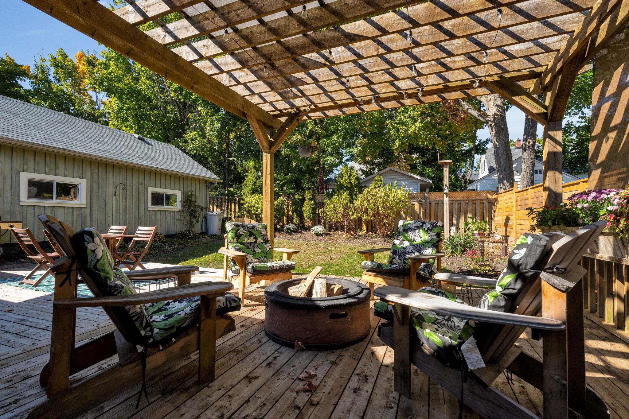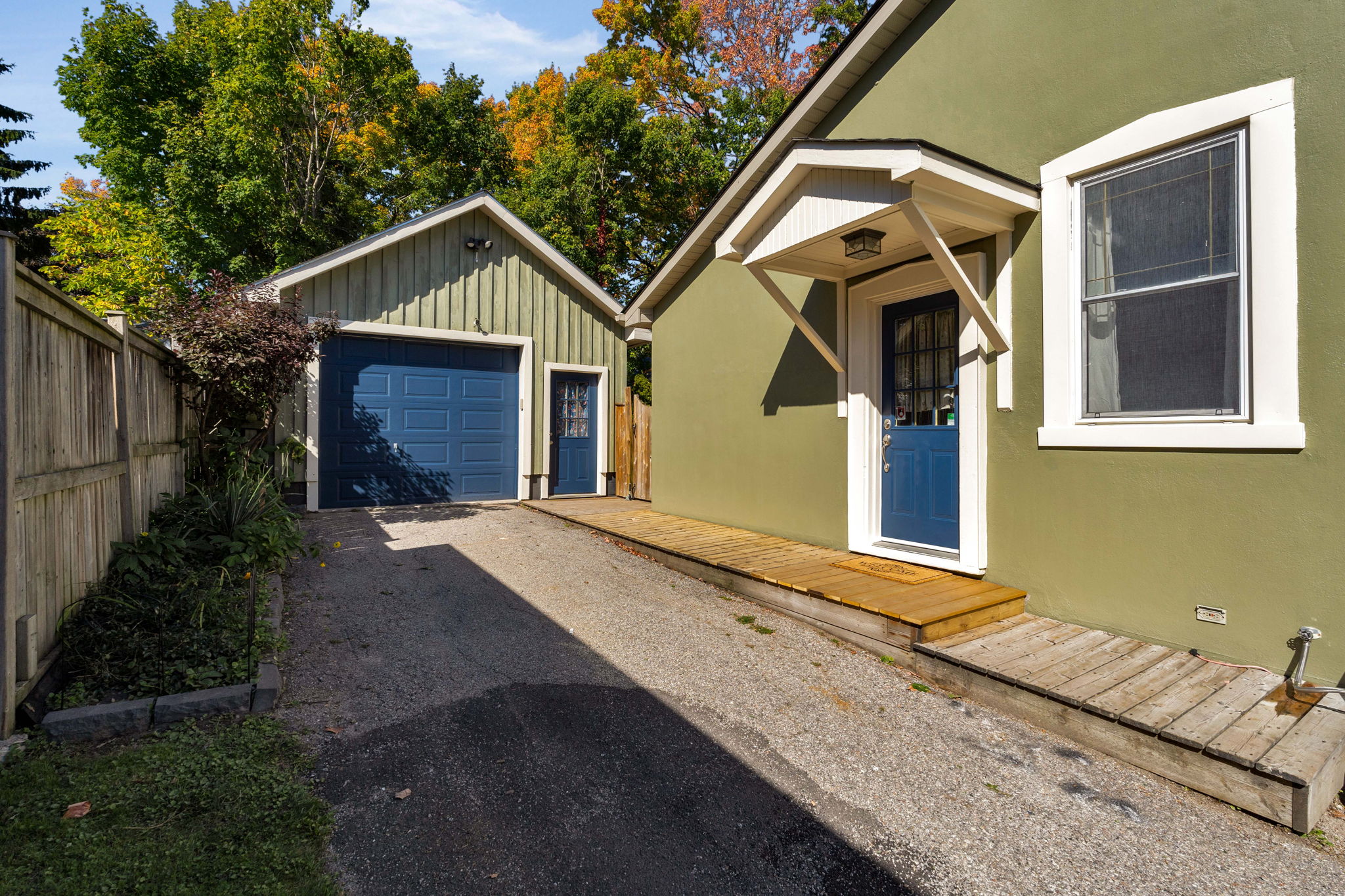 Welcome to this cozy three bedroom charmer with curb appeal private yard and soaring ceilings. Take the flag stone walkway from the long paved driveway through perennials, gardens and nature to your charming covered front porch. Step inside to the immense living space with soaring ceilings, crown moulding, pot lights, sleek hardwood flooring and romantic double sided gas fireplace with granite hearth. The dining space is sun drenched by the sliding doors to the fully fenced yard (right side 2025) where you, guests and your family can enjoy the large deck, pergola and nature. A detached garage is a bonus with 40-amp pony panel which is also drywalled with plenty of extra storage for all of your toys, kayaks and paddle boards (after all you are only 3 minutes to the lake). Back inside the kitchen is functional, adorable and features updated black stainless appliances and a tiled backsplash. A main floor primary bedroom also benefits from the huge ceilings shared in the living space as well as it has hardwood flooring a den perfect for a gym or home office and custom built in wardrobe and organizer with pull out drawers. Another bedroom and updated bathroom with floating vanity complete this level. Downstairs slate flooring adorns the third bedroom perfect for your teenager or visiting family members (or use it as another rec space). There is also a large 3-piece bathroom and an updated laundry room (2024). The house exterior was painted in 2025 and gas meter changed 2025. You are only 1 minute to the Hwy, 2 minutes to the library, 3 minutes to downtown, 3 minutes to a multitude of box stores for all of your shopping needs and walking distance to a handful of schools. Welcome home!