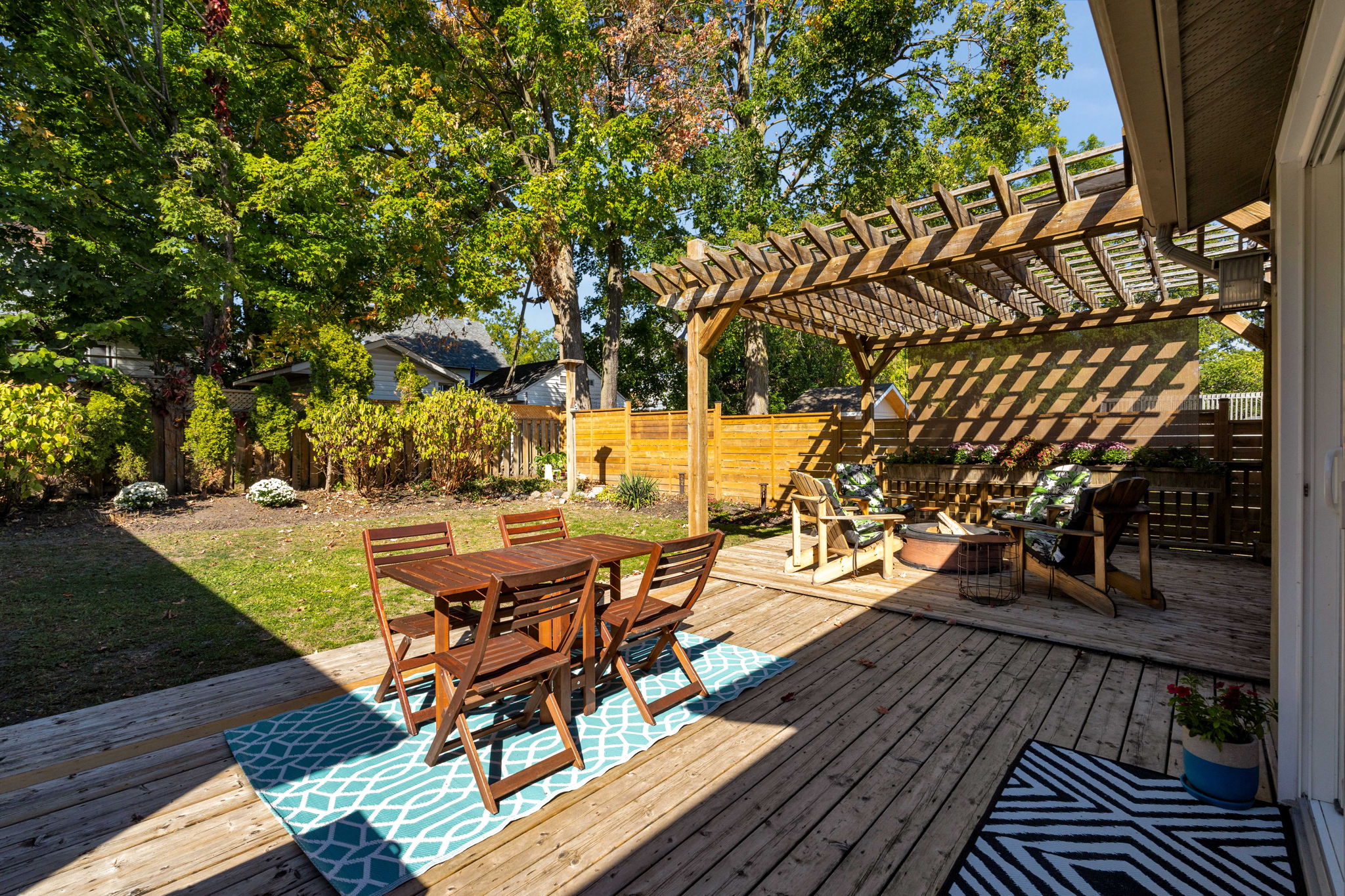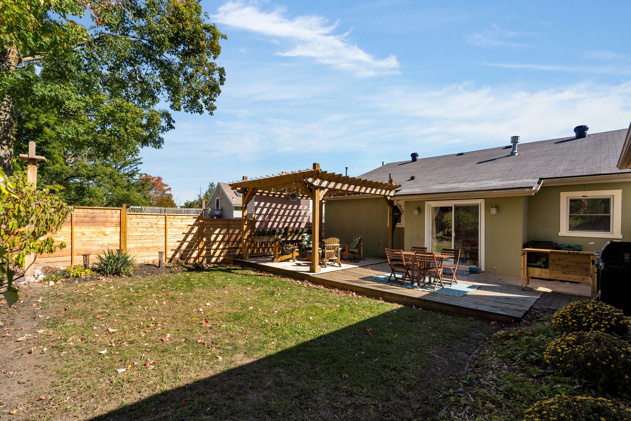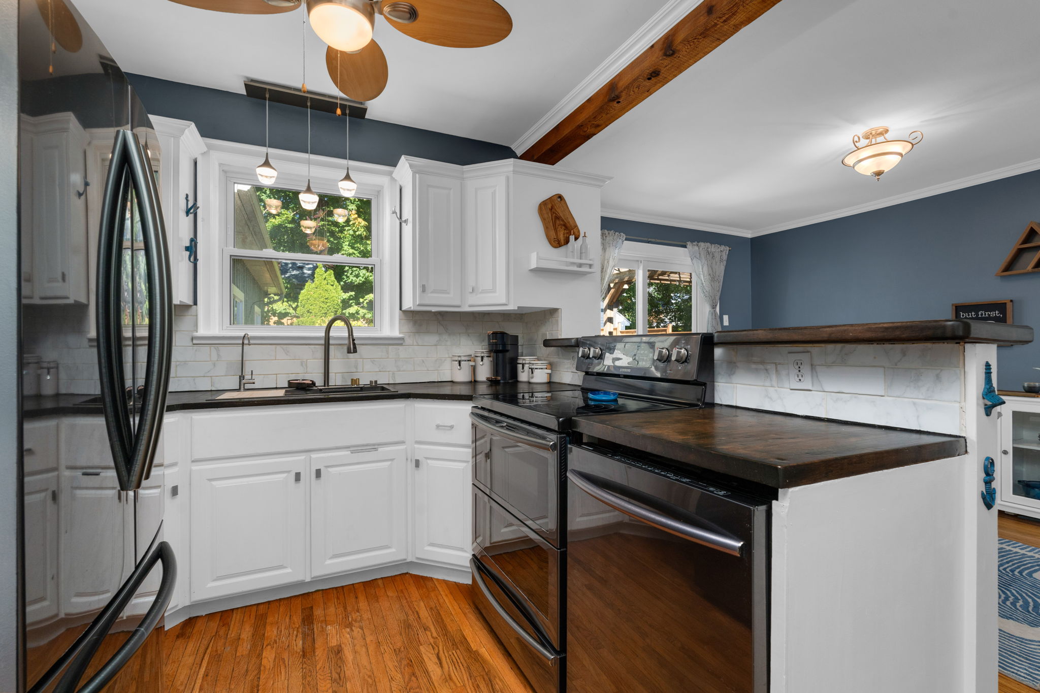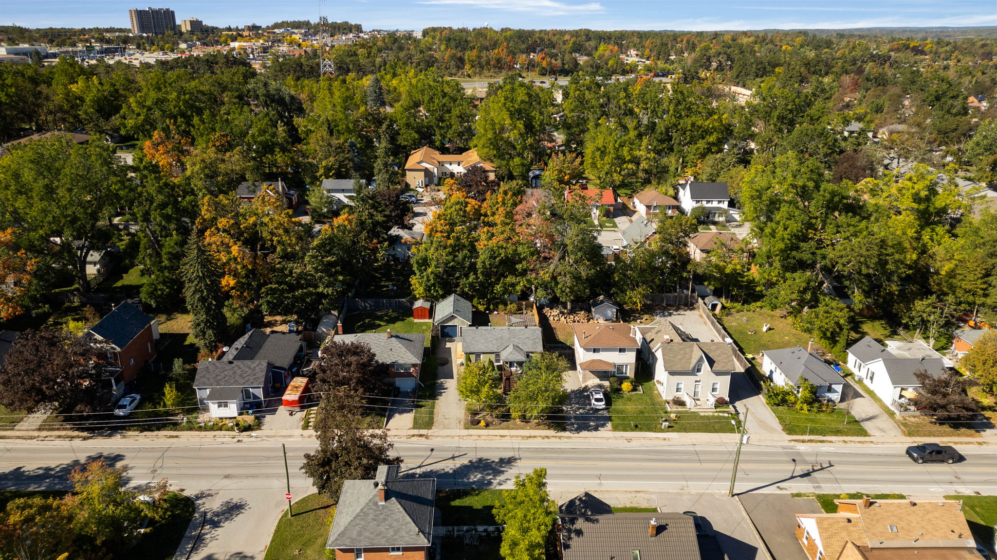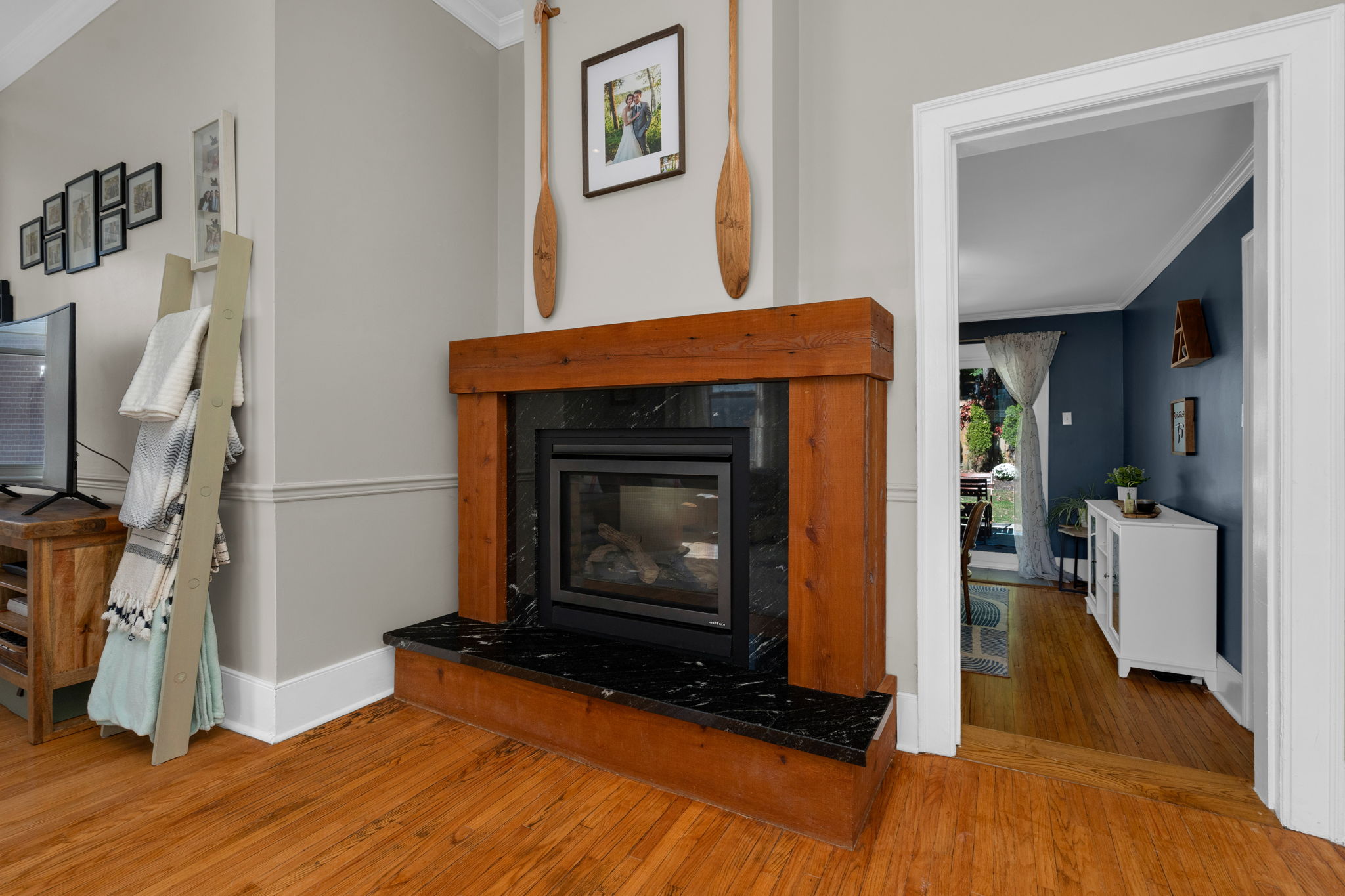 Welcome to this cozy three bedroom charmer with curb appeal private yard and soaring ceilings. Take the flag stone walkway from the long paved driveway through perennials, gardens and nature to your charming covered front porch. Step inside to the immense living space with soaring ceilings, crown moulding, pot lights, sleek hardwood flooring and romantic double sided gas fireplace with granite hearth. The dining space is sun drenched by the sliding doors to the fully fenced yard (right side 2025) where you, guests and your family can enjoy the large deck, pergola and nature. A detached garage is a bonus with 40-amp pony panel which is also drywalled with plenty of extra storage for all of your toys, kayaks and paddle boards (after all you are only 3 minutes to the lake). Back inside the kitchen is functional, adorable and features updated black stainless appliances and a tiled backsplash. A main floor primary bedroom also benefits from the huge ceilings shared in the living space as well as it has hardwood flooring a den perfect for a gym or home office and custom built in wardrobe and organizer with pull out drawers. Another bedroom and updated bathroom with floating vanity complete this level. Downstairs slate flooring adorns the third bedroom perfect for your teenager or visiting family members (or use it as another rec space). There is also a large 3-piece bathroom and an updated laundry room (2024). The house exterior was painted in 2025 and gas meter changed 2025. You are only 1 minute to the Hwy, 2 minutes to the library, 3 minutes to downtown, 3 minutes to a multitude of box stores for all of your shopping needs and walking distance to a handful of schools. Welcome home!