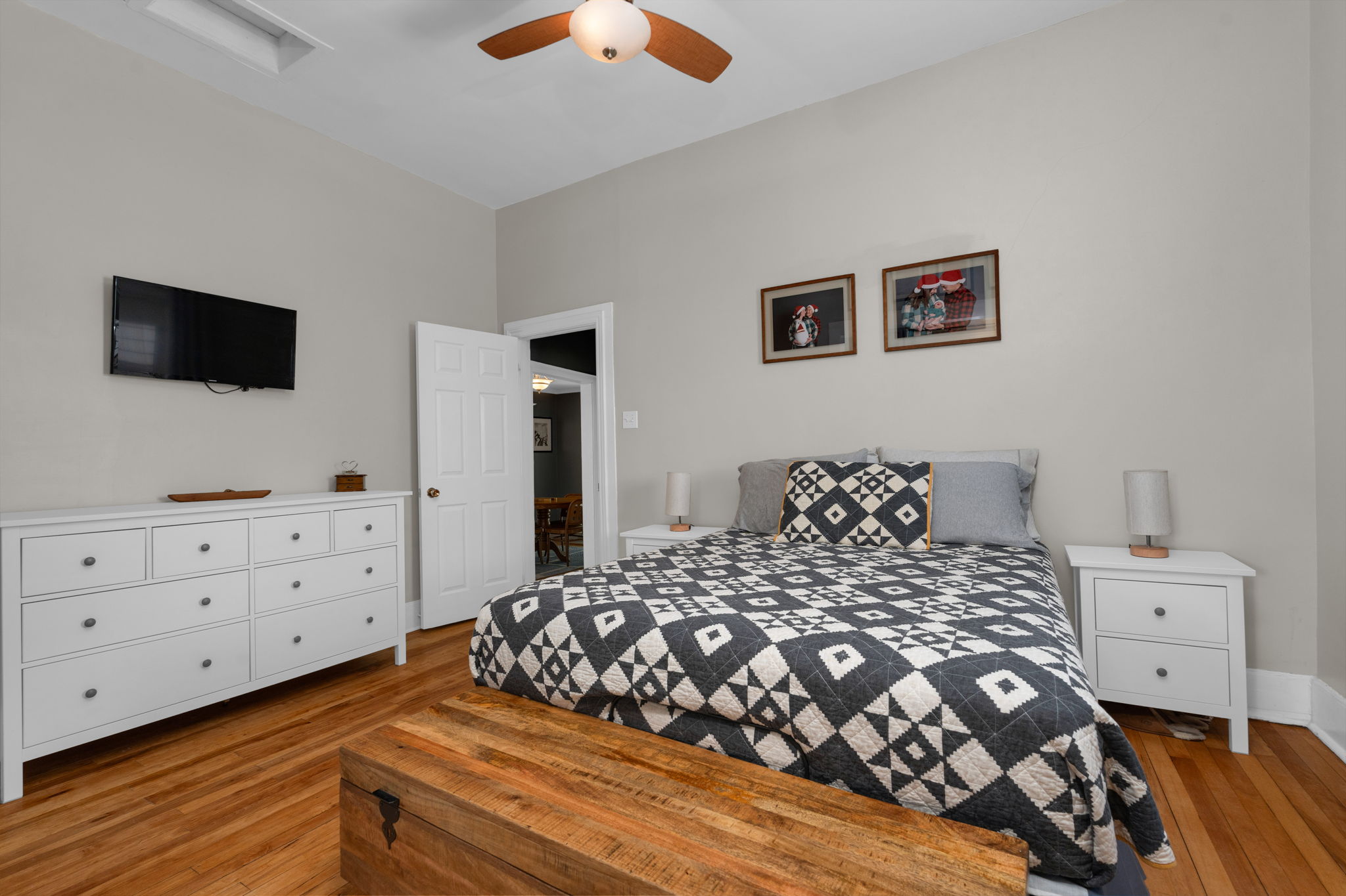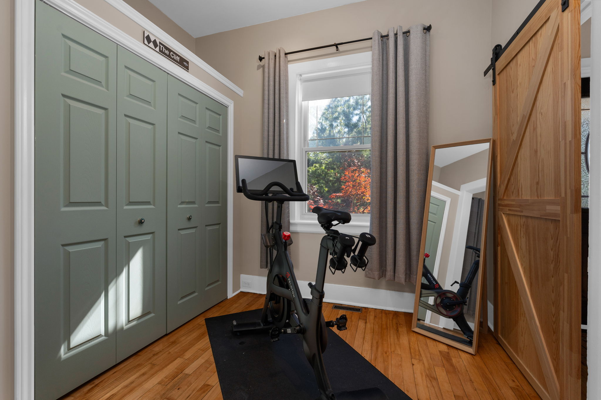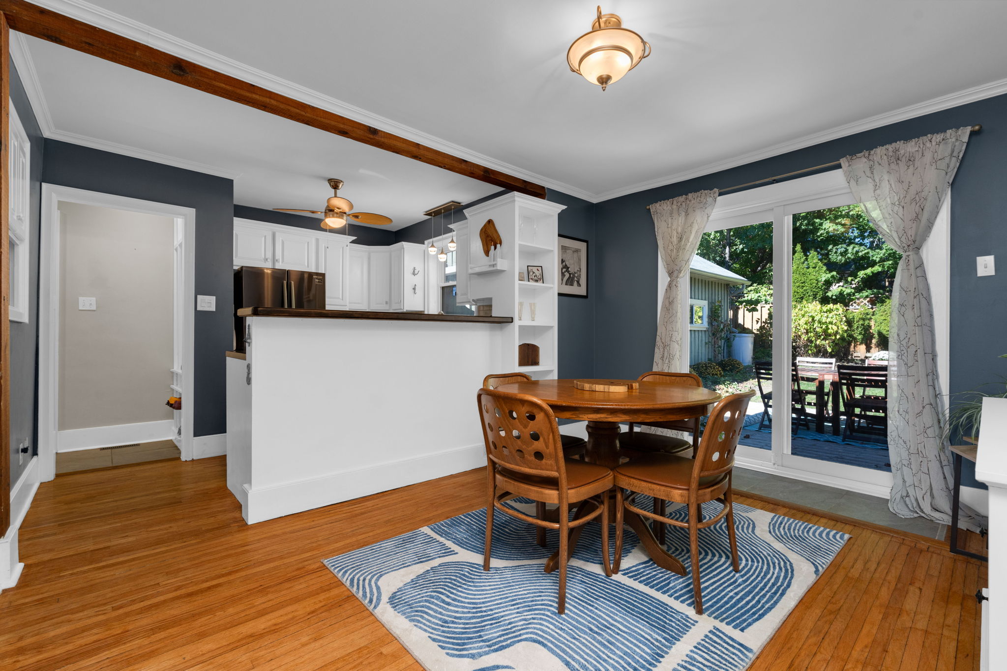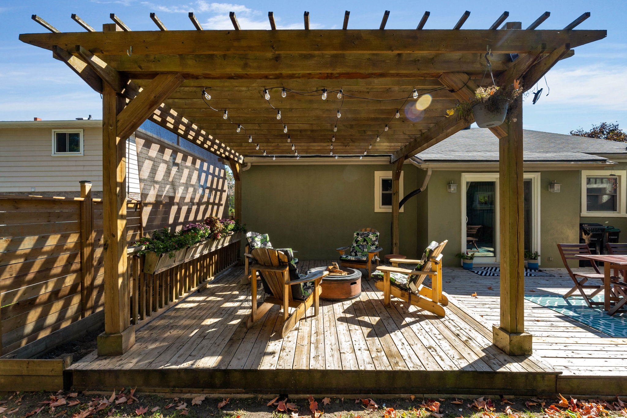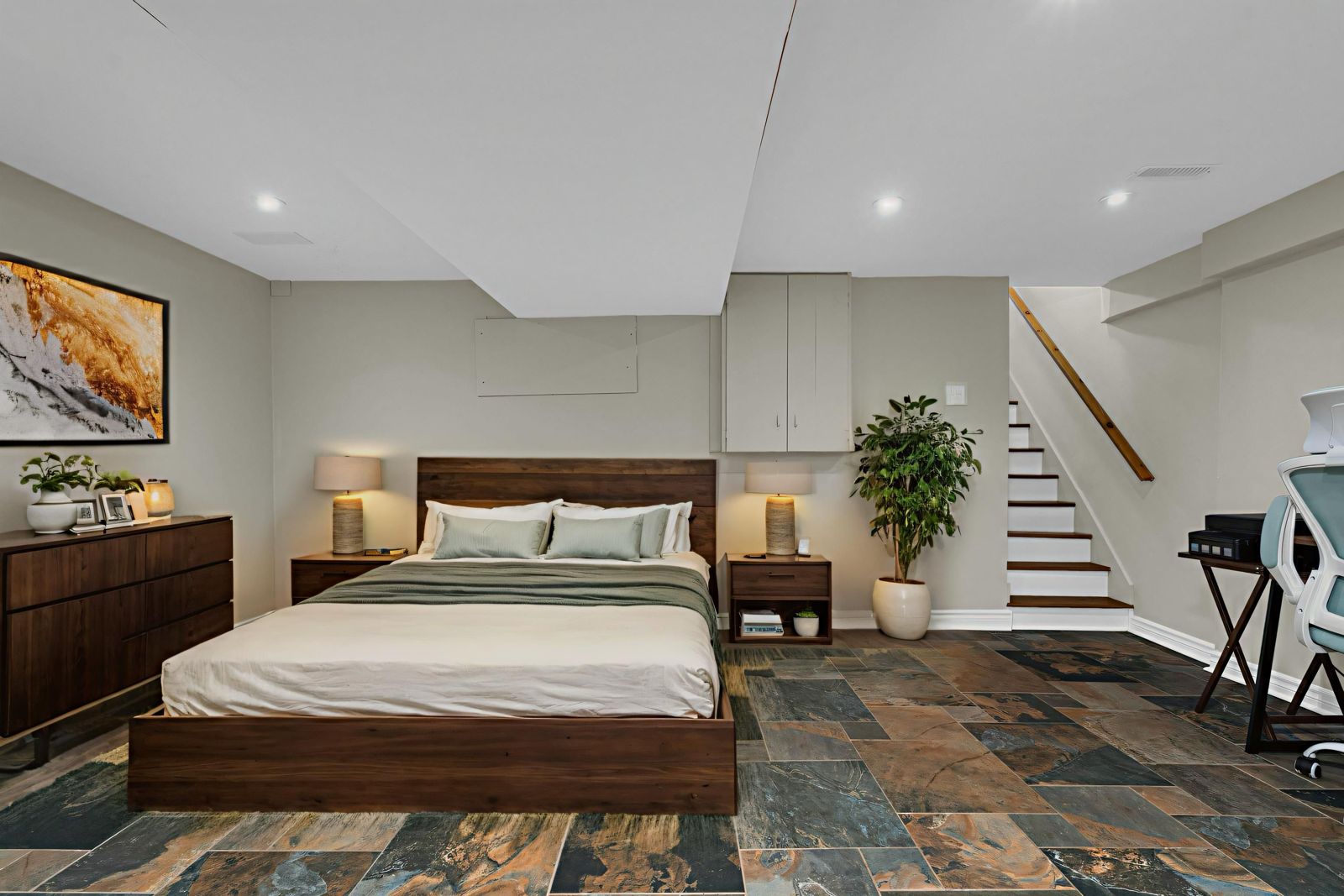 Welcome to this cozy three bedroom charmer with curb appeal private yard and soaring ceilings. Take the flag stone walkway from the long paved driveway through perennials, gardens and nature to your charming covered front porch. Step inside to the immense living space with soaring ceilings, crown moulding, pot lights, sleek hardwood flooring and romantic double sided gas fireplace with granite hearth. The dining space is sun drenched by the sliding doors to the fully fenced yard (right side 2025) where you, guests and your family can enjoy the large deck, pergola and nature. A detached garage is a bonus with 40-amp pony panel which is also drywalled with plenty of extra storage for all of your toys, kayaks and paddle boards (after all you are only 3 minutes to the lake). Back inside the kitchen is functional, adorable and features updated black stainless appliances and a tiled backsplash. A main floor primary bedroom also benefits from the huge ceilings shared in the living space as well as it has hardwood flooring a den perfect for a gym or home office and custom built in wardrobe and organizer with pull out drawers. Another bedroom and updated bathroom with floating vanity complete this level. Downstairs slate flooring adorns the third bedroom perfect for your teenager or visiting family members (or use it as another rec space). There is also a large 3-piece bathroom and an updated laundry room (2024). The house exterior was painted in 2025 and gas meter changed 2025. You are only 1 minute to the Hwy, 2 minutes to the library, 3 minutes to downtown, 3 minutes to a multitude of box stores for all of your shopping needs and walking distance to a handful of schools. Welcome home!
